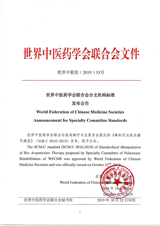 在无数蜂疗人的热切期待中,由李万瑶教授领衔主编的首个蜂疗行业国际标准——《蜂针疗法技术操作规范》获准发布,这在蜂疗大业发展历史上具有里程碑意义。《蜂针疗法技术操作规范》标准的问世,是蜂疗行业适应新时代发展的切实举措,填补了行业空白,象征着蜂界标准化运营达到了崭新的目标。同时,它为行业健康发展指出了明确方向,是未来蜂疗行业标准化、规范化的典范!